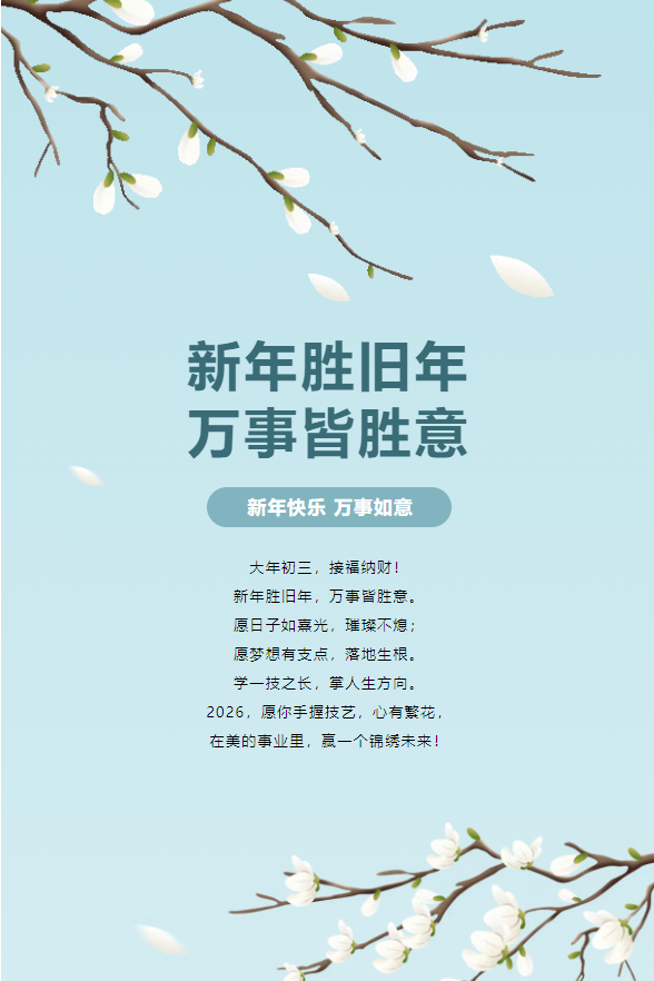 大年初三,三阳开泰。 站在丙午新岁的门槛,愿新年胜旧年, 温柔而有力量,照亮每一段逐梦的征程。 世间最坚实的幸福,莫过于手握一技之长。 它是熹光中的锋芒,是岁月里的底气。 愿你在新的一年,以匠心致初心,以技能赢未来; 剪绘锦绣,妆点韶华,用手中的技艺成就熠熠生辉的美好人生! 沈阳标榜美容美发学校 恭祝大家: 新春大吉,万事胜意,学有所成,技高万丈!